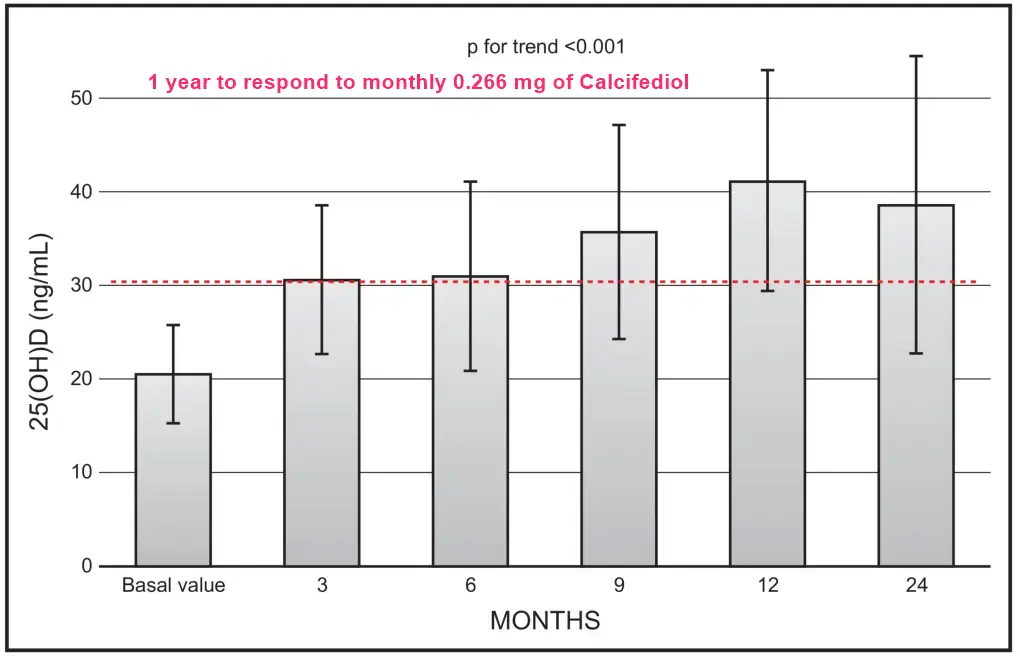Results: The patients' mean age was 62.4 ± 9.0 years. Mean basal 25(OH)D levels were 20.5 ± 5.3 ng/mL. There was a continuous increase of mean 25(OH)D values (p for trend < 0.001). However, mean values at month 24 (36.7 ± 15.9) were not significantly different in respect to values at month 12 (41.2 ± 11.18). At 24 months, only 1 out 19 patients had a value <20 ng/mL. There was a significant decrease with time of mean values of bALP (p < 0.0216), with no significant changes between 12 and 24 months. No significant changes were observed as far as ionised calcium or creatinine were concerned.