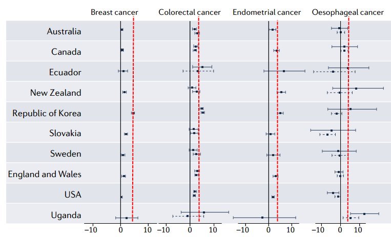 breast, colorectum, Endometrium, oesophagus, extrahepatic bile duct, gallbladder, head and neck, kidney, liver, bone marrow, pancreas, prostate, stomach and thyroid