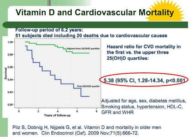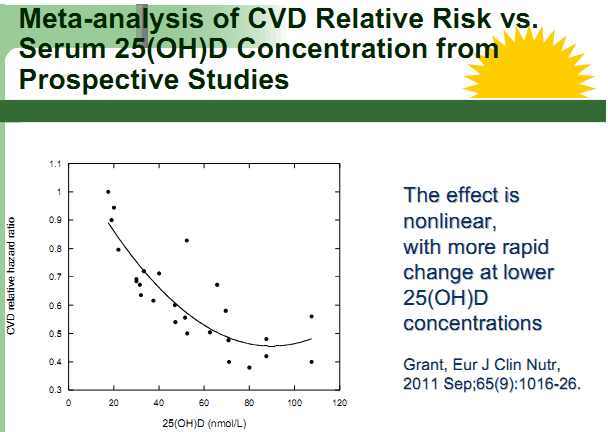 Included in the talk will be an overview of the epidemiological findings regarding vitamin D and risk of cardiovascular diseases, the mechanisms whereby vitamin D might reduce the risk of cardiovascular disease, and the amount of vitamin D required to achieve optimal serum 25-hydroxyvitamin D concentration