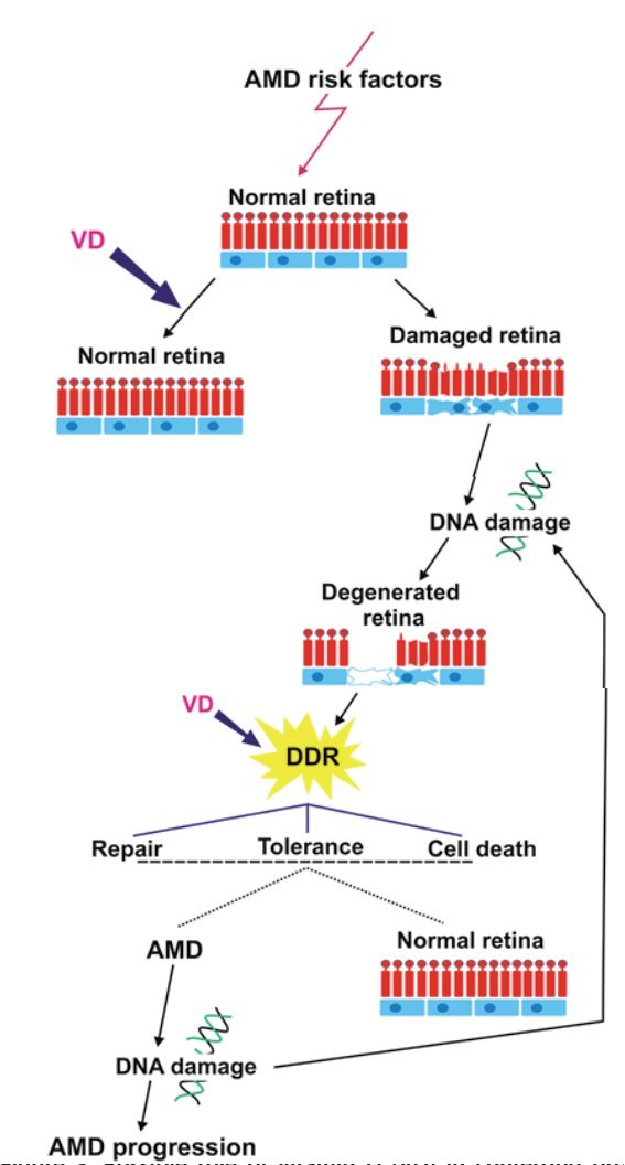 Dietary vitamin D plays an important role in maintaining proper vision. Age-related macular degeneration (AMD) is a complex eye disease with unknown pathogenesis. Studies on dietary supplementation and AMD occurrence and progression have produced conflicting results. In its advanced stage, AMD may be associated with apoptosis, pyroptosis or necroptosis of retinal cells. Vitamin D has been reported to play a role in modulating each of these programmed death pathways. Vitamin D is a modulator of the immune system and it acts synergistically with two members of the regulators of complement activation family H and I, whose specific variants are the most important genetic factors for AMD pathogenesis. Angiogenesis is an essential component of the neovascular form of AMD, the most devastating type of the disease and vitamin D is reputed to possess antiangiogenic properties. Cellular DNA damage response is weakened in AMD patients and so it is another process that can be modulated by vitamin D. Finally, impaired autophagy is claimed to play a role in AMD and emerging evidence suggests that vitamin D can influence autophagy. Therefore, several pathways of vitamin D metabolism and AMD pathogenesis overlap, suggesting that vitamin D could modulate the course of AMD.