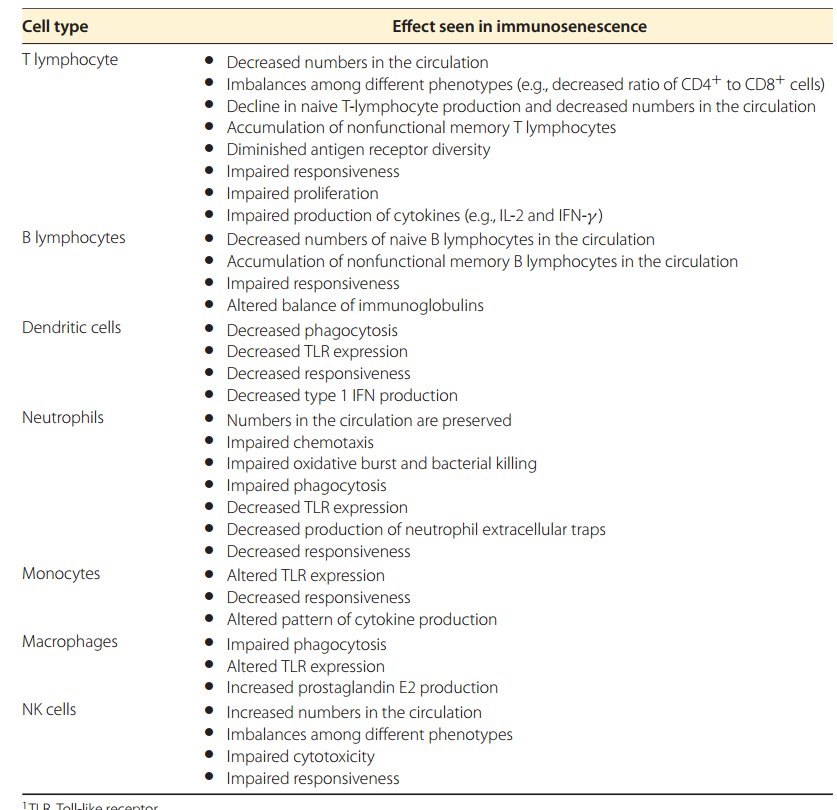 The immune system is key to host defense against pathogenic organisms. Aging is associated with changes in the immune system, with a decline in protective components (immunosenescence),- increasing susceptibility to infectious disease, and a