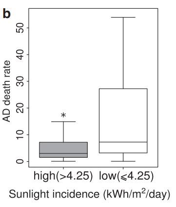 The literature suggests that decline in VD concentrations may be involved in the establishment and progression of AD. According to sunlight data, we can conclude that countries with low average sunlight have high AD death rate.