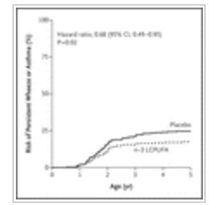 A total of 695 children were included in the trial, and 95.5% completed the 3-year, double-blind follow-up period. The risk of persistent wheeze or asthma in the treatment group was 16.9%, versus 23.7% in the control group (hazard ratio, 0.69; 95% confidence interval CI, 0.49 to 0.97; P=0.035), corresponding to a relative reduction of 30.7%.