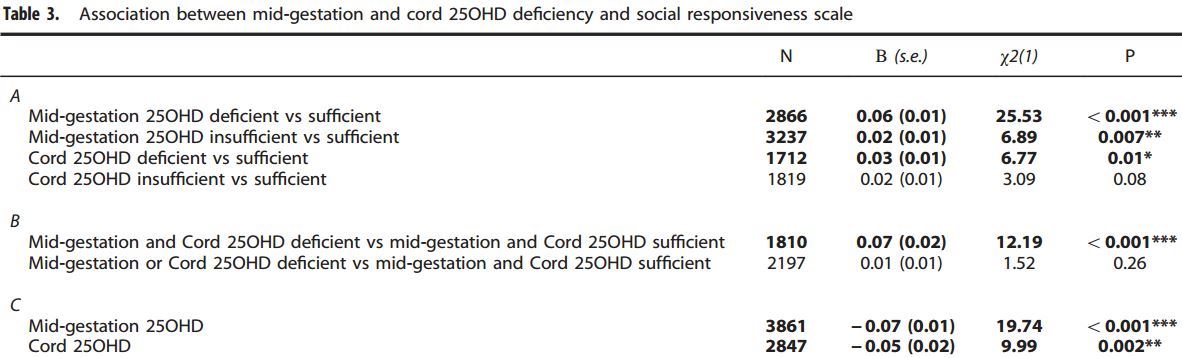 Correspondence: Professor JJ McGrath, Queensland Brain Institute, University of Queensland, St Lucia, Brisbane, QLD 4072, Australia. E-mail: j.mcgrath at uq.edu.auThere is intense interest in identifying modifiable risk factors associated with autism-spectrum disorders (ASD). Autism-related traits, which can be assessed in a continuous fashion, share risk factors with ASD, and thus can serve as informative phenotypes in population-based cohort studies. Based on the growing body of research linking gestational vitamin D deficiency with altered brain development, this common exposure is a candidate modifiable risk factor for ASD and autism-related traits. The association between gestational vitamin D deficiency and a continuous measure of autism-related traits at ~6 years (Social Responsiveness Scale; SRS) was determined in a large population-based cohort of mothers and their children (n=4229). 25-hydroxyvitamin D (25OHD) was assessed from maternal mid-gestation sera and from neonatal sera (collected from cord blood). Vitamin D deficiency was defined as 25OHD concentrations less than 25 nmol l 1. Compared with the 25OHD sufficient group (25OHD>50 nmol l 1), those who were 25OHD deficient had significantly higher (more abnormal) SRS scores (mid-gestation n=2866, β=0.06, P<0.001; cord blood n=1712, β=0.03, P=0.01).