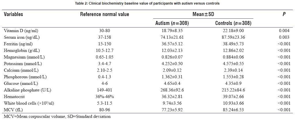 Conclusion: This study suggests that deficiency of iron and Vitamin D as well as anemia were more common in autistic compared to control children.