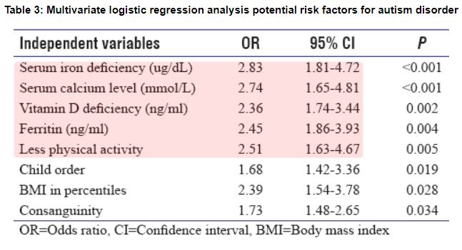 Multivariate logistic regression analysis revealed that serum iron deficiency, serum calcium levels, serum Vitamin D levels; ferritin, reduced physical activity; child order, body mass index percentiles, and parental consanguinity can all be considered strong predictors and major factors associated with autism spectrum disorders.