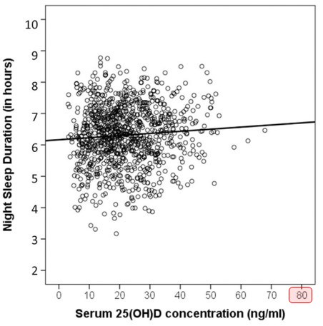 It is hypothesized that vitamin D has a potential role in the regulation of sleep [11,12]. Sleep disorders are also widely common [13]: The prevalence of sleep disorders ranges from 25% to 32.1% depending on study population and assessment methods [14–16]. Sleep disorders were also considered to play a role in the aetiology of many other disorders such as hypertension [17], heart diseases [18] and diabetes [19]. Furthermore, it has been shown that adults with shorter sleep duration exhibit more health risk factors, e.g. obesity, physical inactivity, smoking and alcohol consumption [20]. Since 2009 there has been an increase regarding studies focusing on the relationship between serum vitamin D concentration (as well as vitamin D intake) and different sleep parameters [21]. For instance, a positive association between serum 25-hydroxyvitamin D (25(OH)D) concentrations and self-reported daily sleep duration was demonstrated among elderly adults [22]. Contrary, Shiue (2013) found no relationship between sleep duration and serum 25(OH)D concentrations; but reported a significant inverse association between sleep onset latency (minutes to fall asleep) and serum 25(OH)D concentrations [23]. Additionally, an inverse correlation between Epworth Sleepiness Scale (ESS) scores, indicating daytime sleepiness, and serum 25(OH)D concentration was reported for patients without vitamin D deficiency (25(OH)D >20 ng/mL) but no correlation between ESS scores and serum 25(OH)D concentrations was found in patients with actual vitamin D deficiency [24]. Surprisingly, a direct correlation between ESS scores and serum 25(OH)D levels was reported in black patients with vitamin D deficiency. Beydoun et al. (2014) [25] also reported a significant inverse relationship between serum 25(OH)D concentrations and a factor analytically derived sub-scale of a sleep questionnaire reflecting sleepiness. However, only a marginal negative association was reported between serum 25(OH)D concentrations and very short sleep, when a sub-group with very short sleep duration (<5 hours per night) was compared to a sub-group with normal sleep duration (7–8 hours per night). Among Korean workers an odds ratio of 1.43 for having poor sleep quality (PSQI (Pittsburgh Sleep Quality Index) score<5) was found in case of vitamin D deficiency (<10 ng/mL) [26].