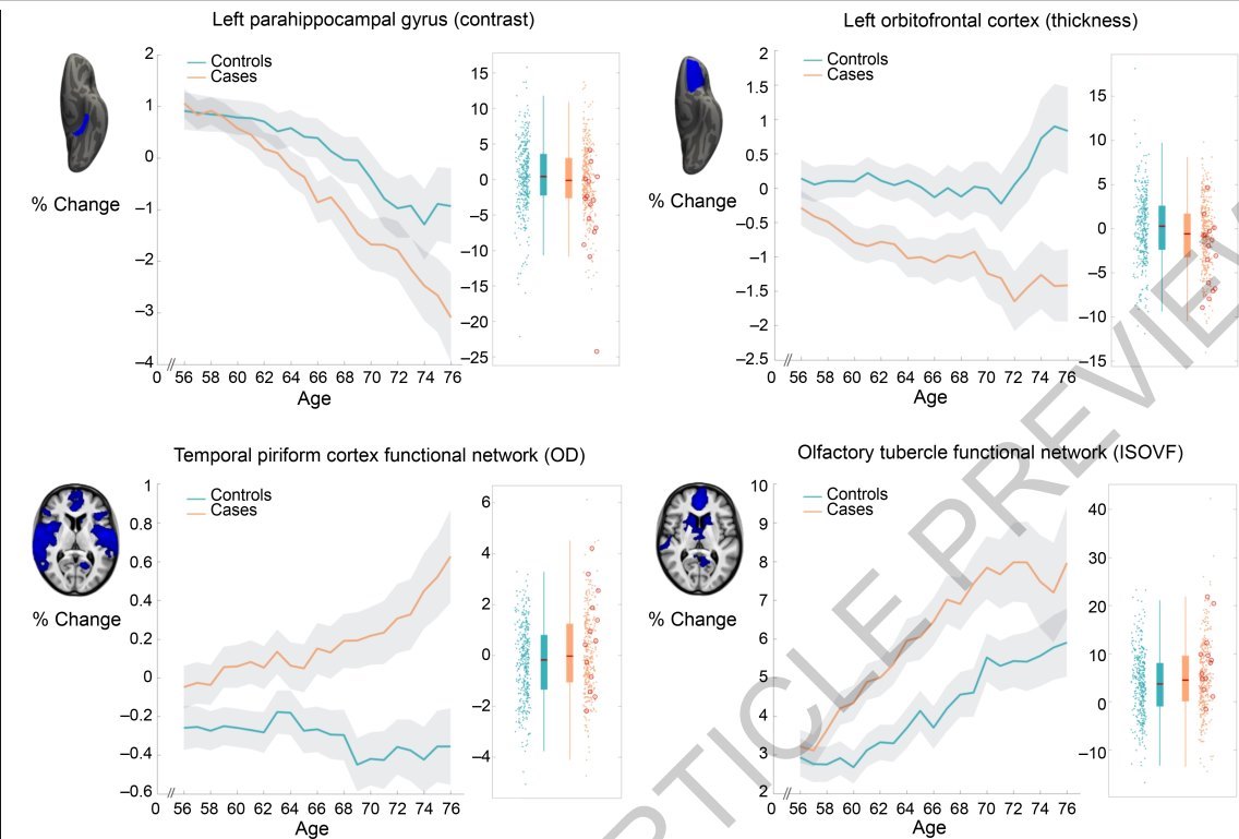 - (ii) greater changes in markers of tissue damage in regions functionally-connected to the primary olfactory cortex, and