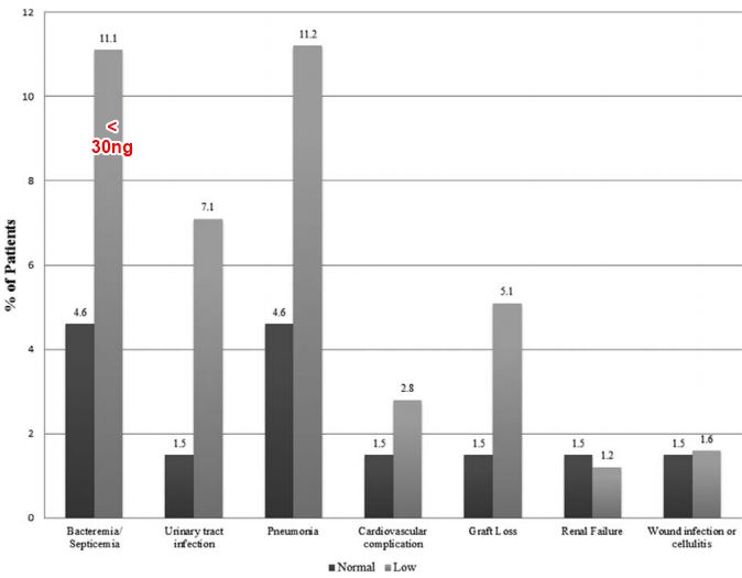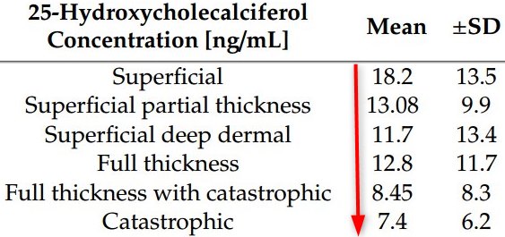 Another study 2 reported that worsening severity of vitamin D deficiency is associated with increased length of stay, surgical intensive care unit cost, and mortality in burn patients. It also noted that low serum levels of vitamin D in major burn patients persisted for at least 1 year post-injury and that there was a strong negative correlation between circulating 25(OH)D levels and scarring at year 1 post-injury.
