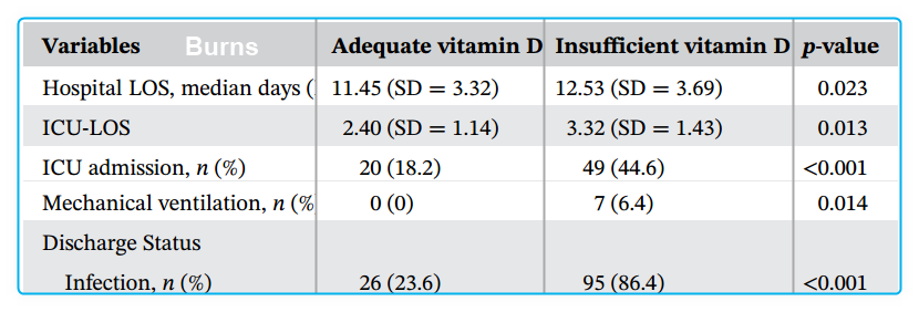 Lastly, the study in 4 found that a large proportion of patients with burn injury presented with vitamin D insufficiency and deficiency, which was associated with poor outcomes, including prolonged intensive care unit and hospital length of stay.