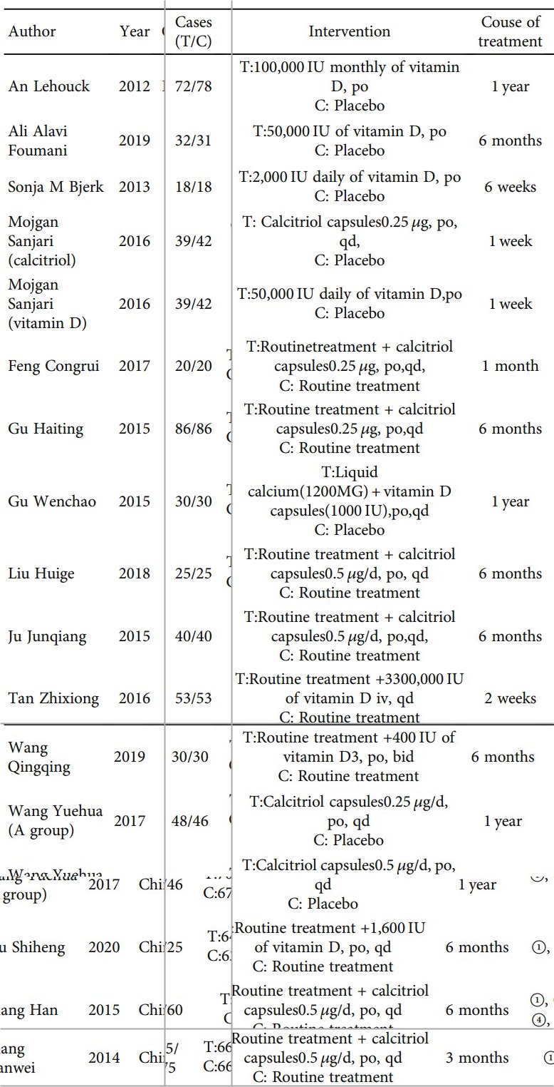 Results. A total of 15 articles involving 1598 participants were included in this study. The overall results showed a statistical significance of vitamin D therapy in patients with COPD which can significantly improve forced expiratory volume in 1 second (FEV1) (MD: 5.69, 95% CI: 5.01-6.38,,) and FEV1/FVC (SMD:0.49, 95% CI: 0.39-0.60,,); and serum 25 (OH)D (SMD:1.21, 95% CI:1.07-1.34,,) also increase CD3+ Tcells (MD: 6.67, 95% CI: 5.34-8.00,,) and CD4+ T cells (MD: 6.00, 95% CI: 5.01-7.00,,); and T lymphocyte CD4+/CD8+ ratio (MD: 0.41, 95% CI: 0.20-0.61,,) obviously decrease CD8+ Tcells(SMD: -0.83, 95% CI: -1.05- -0.06,,), the times of acute exacerbation (RR: 0.40, 95% CI: 0.28-0.59,,), and COPD assessment test (CAT) score (MD: -3.77, 95% CI: -5.86 - -1.68,,).