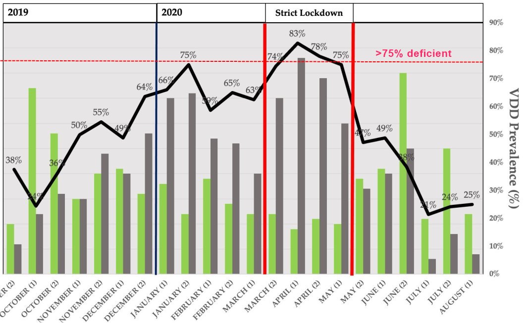 >75% of pregnant women were deficient (<20 ng) duing strict lockdown