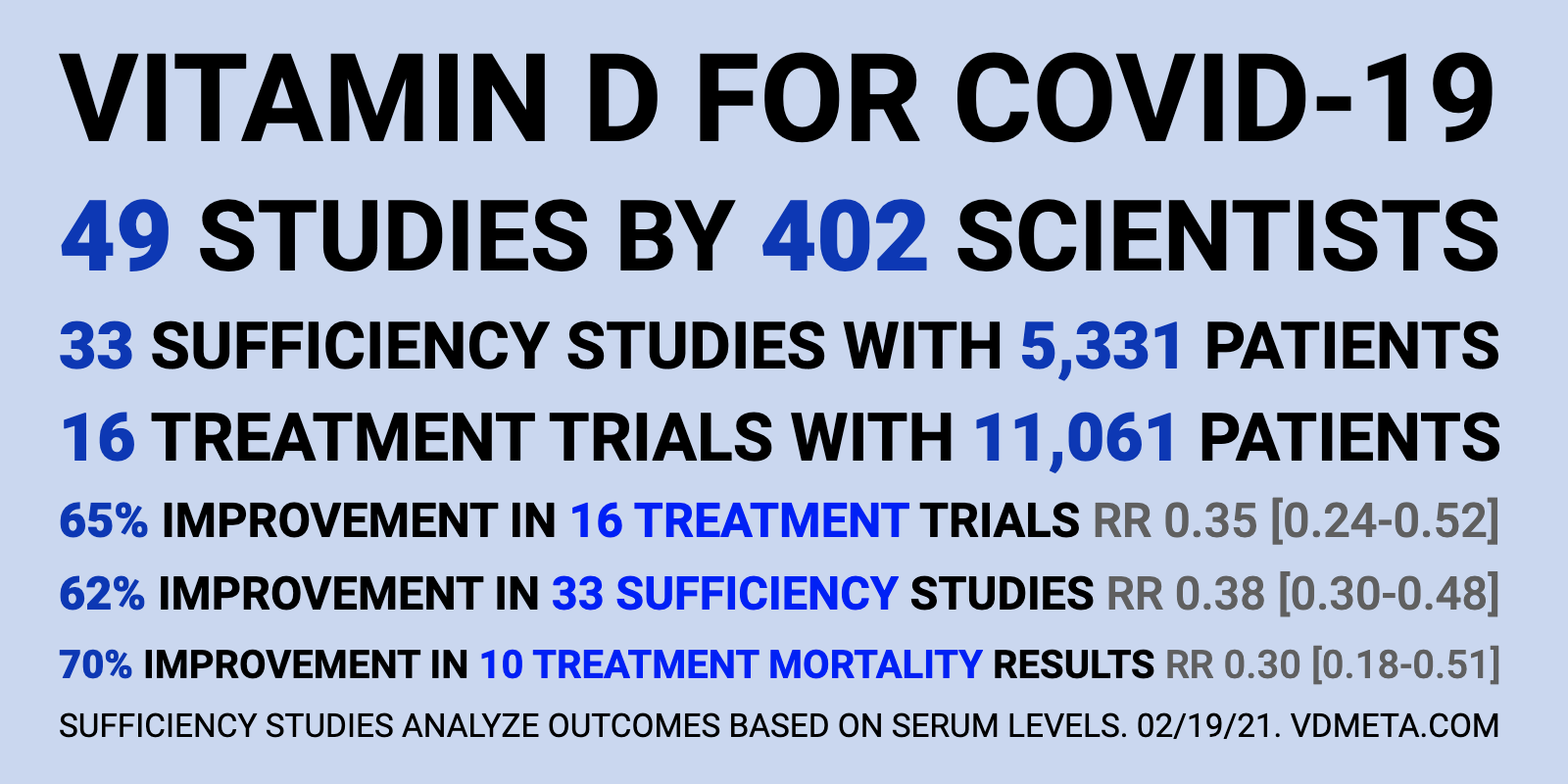 - COVID-19 mortality 3X more likely if low vitamin D (999,179 people) – meta-analysis March 29, 2021