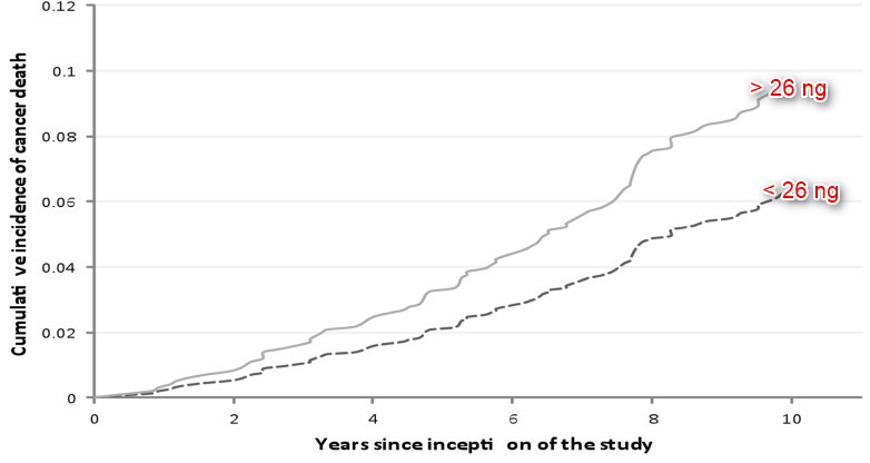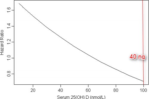 The excess risk for cancer death was observed with serum 25 (OH) D concentration less than 64 nmol/L (the median value) [adjusted HR: 1.61 (95% CI: 1.02 - 2.54, p = 0.04].