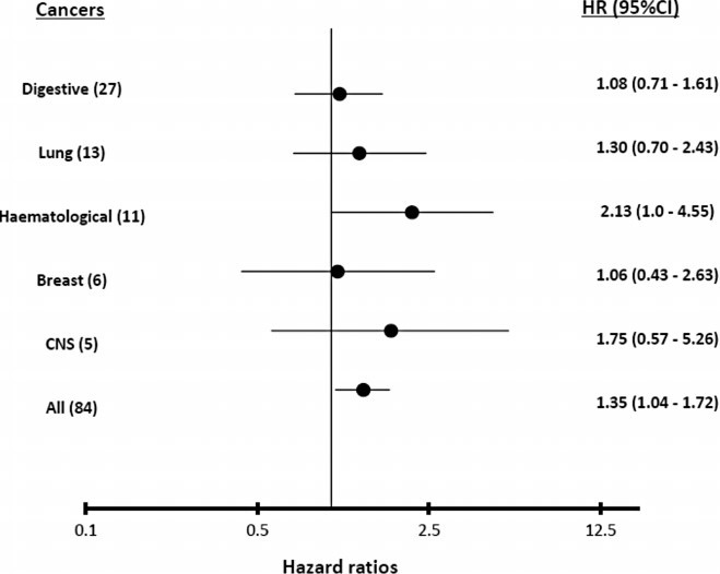 The excess risk appeared to be site-specific and greatest in those with haematological cancers [adjusted HR: 2.13: 95% CI: 1.0 – 4.55, p = 0.05].