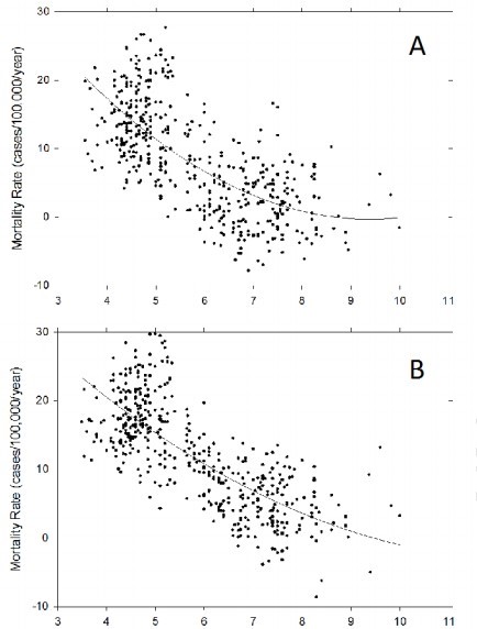 Since these initial insightful observations a multitude of epidemiologic studies have reported an association with decreased sun exposure or lower vitamin D status with increased risk for a variety of cancers including breast, colon, lymphoma, lung and prostate cancers16. Grant9 evaluated mortality due to cancer and related it to UV exposure in both men and women. He found a dramatic inverse relationship (Fig 2)