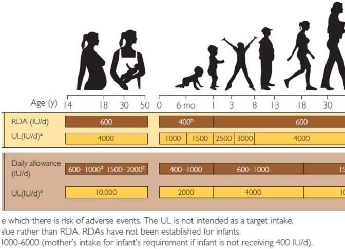 The IOM suggests that a 25(OH)D >20 ng/mL is all that is required to maximize bone health and they ignored the association studies concluding that there is no benefit of improving vitamin D status for other health outcomes measures including reducing risk of cancer and cancer mortality55. The Endocrine Society concluded based on all of the available literature that a minimum serum level of 25(OH)D to maximize bone health was 30 ng/mL56. Furthermore, the Endocrine Society guidelines committee reviewed many of the epidemiologic studies and concluded that there may be additional health benefits that require further investigation including reducing risk of cancers. To achieve a blood level of at least 20 ng/mL the IOM recommended 400 IUs daily for children under one year of age, 600 IUs daily for children one year and older and all adults up to the age of 70 years and 800 IUs daily for adults over the age of 70. The Endocrine Society recommends children under one year of age require 400-1000 IUs daily, children one year and older 600-1000 IUs daily and all adults 1500-2000 IUs daily to sustain a circulating serum level of 25(OH)D >30 ng/mL (Fig 4). They also recognized that obese children and adults required 2-3 times more vitamin D to treat and prevent vitamin D deficiency. To treat vitamin D deficiency various strategies can be employed the most common is to give 50,000 IUs of vitamin D2 (the pharmaceutical form of vitamin D available in United States) once a week for 8 weeks which is equivalent to ingesting approximately 6000 IUs daily which can be equally effective. To prevent recurrence it was recommended that 50,000 IUs of vitamin D2 once every 2 weeks which is equivalent to approximately 3000 IUs daily is effective . This strategy has been successfully employed for up to 6 years without any untoward toxicity . Additional sources of vitamin D which can be variable can be obtained from dietary sources and sensible sun exposure. The use of the mobile phone app Dminder.info provides guidelines anywhere on the globe at any time of the year for how much sun exposure is required to make sufficient vitamin D while at the same time alerting the user after the sensible sun exposure to either wear sun protection or get out of the sun to prevent the damaging effects from excessive exposure to sunlight.