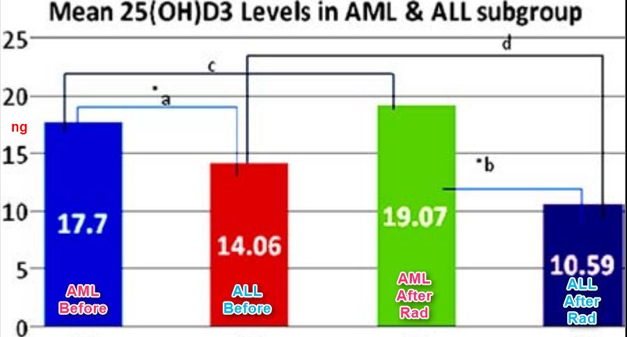 Methodology: This study was case control, all newly diagnosed patients of acute leukemia between the age of one to sixty years and residents of Pakistan were enrolled and evaluated. Those who were unwilling or unable to provide written informed consent were excluded. All selected patients (n=86) were grouped in to acute myeloid leukemia (AML) and acute lymphoblastic leukemia (ALL). AML was further categorized as A1 before remission-induction (n=17) and B1 after remission induction (n=13), ALL was further categorized as A2 before remission-induction (n=31) and B2 after remission induction (n=25). The 25-hydroxyvitamin [25(OH)D3] levels were measured in the sera of all patients (before and after remission-induction) by one step delayed chemiluminescent micro particle immunoassay (CMIA).We compared 25(OH)D3 levels in all patients before and after the remission-induction chemotherapy.
