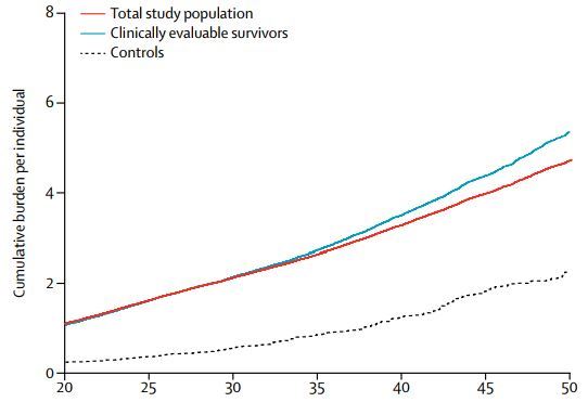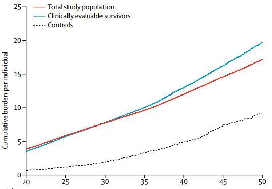 - “Cumulative burden was calculated using the method of mean cumulative count, which estimates the mean number of recurrent or multiple health events that a cohort member has by a given timepoint in the presence of competing risk events”