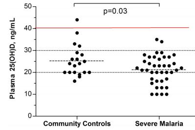 Vitamin D plays an increasingly recognized role in the innate and adaptive immune response to infection. Based on demonstrated roles in up-regulating innate immunity, decreasing inflammation, and reducing the severity of disease in illnesses such as tuberculosis and influenza, we hypothesized that poor vitamin D status would be associated with severe malaria. We measured 25-hydroxyvitamin D [25(OH)D] by immunoassay in a sample of Ugandan children aged 18 months-12 years with severe malaria (cerebral malaria or severe malarial anemia, n = 40) and in healthy community children (n = 20). Ninety-five percent of children with severe malaria (n = 38) and 80% of control children (n = 16) were vitamin D-insufficient [plasma 25(OH)D <30 ng/mL]. Mean plasma 25(OH)D levels were significantly lower in children with severe malaria than in community children (21.2 vs. 25.3 ng/mL, p = 0.03). Logistic regression revealed that for every 1 ng/mL increase in plasma 25(OH)D, the odds of having severe malaria declined by 9% [OR = 0.91 (95% CI: 0.84, 1.0)]. These preliminary results suggest that vitamin D insufficiency may play a role in the development of severe malaria. Further prospective studies in larger cohorts are indicated to confirm the relationship of vitamin D levels to severity of malaria infection and to investigate causality.