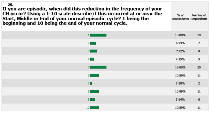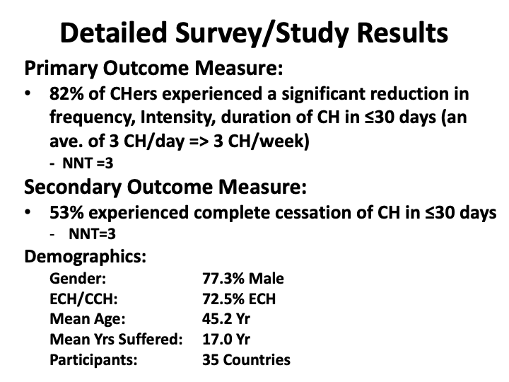 0:29:26.3 Pete: So I put a question in the questionnaire and it says, "When during your cycle and divided up into 10 parts, did you experience the favorable response?" Well, I... And I let the computer do all that work for me and it brought me back a graph and it turns out that about 20% of the cluster headache sufferers, the episodic cluster headache sufferers experienced the favorable response near the end of their... At the nine and the 10 position, when you divide out the time frame of their individual cluster cycle. So I can realistically subtract 20% from that 87 and I'm down to 67 to 64, or 67 to 62. That's awash. It's the same. So for the people... And, oh, by the way, that 64 number is also the percentage of CH-ers who started this treatment protocol, who experienced a complete cessation of cluster headaches.