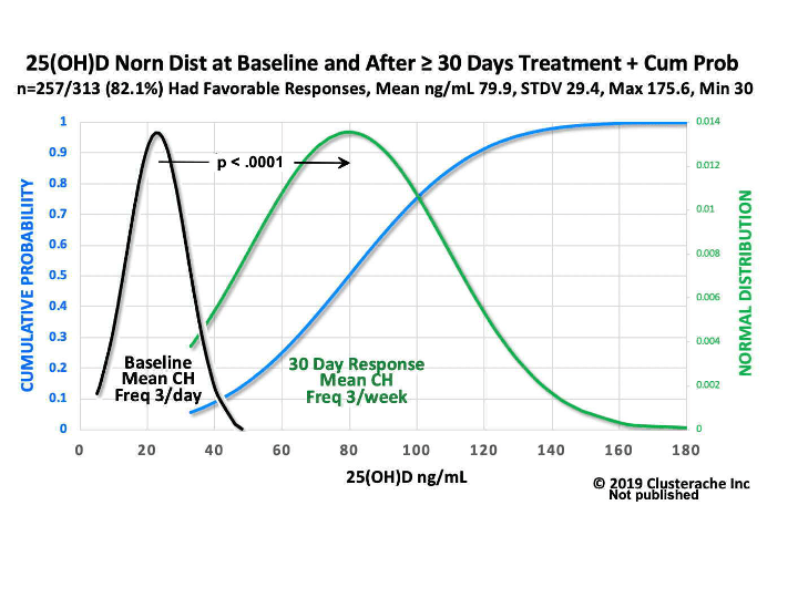 0:27:58.7 Pete: On basically cluster headaches sufferers, episodic cluster headache sufferers. They don't know. So one of the things that they do in those studies is they try and select people who are just starting their annual cycle. So they're not gonna be confused by end of cycle. So if you look at the chart here, you can see these are normal distribution curves. The black curve is of the 313 that submitted their blood test information, that's their 25-OH to start with. And the mean was 24 nanograms per milliliter. That's the top of the peak, 24 nano. The big guy at far end was 47 nanograms per milliliter. Now, I don't have my calculator with me, but basically, two and a half times that to get nanomoles. After a month, which included a loading cycle, they all moved over under the green curve and there's a P value of 0.0001, which means this is really good. This is not just a happenstance. So that factor is out the window. This is real. This is real data, statistically significant with respect to the change in 25... Serum 25-OH.