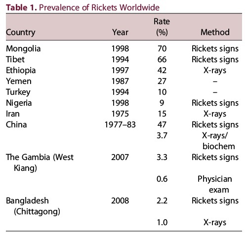 Currently, there is still a high incidence of rickets, mainly based on clinical signs, in different countries around the world (Table 1).(11) Based on the widespread global prevalence of rickets, a task force should be established to deal with this problem. Such a task force comprised of representatives from societies such as the International Society of Endocrinology, the International Federation of Musculoskeletal Research Societies, the Pediatric Endocrine Society, and the European Society for Paediatric Endocrinology, as well as representatives from the vitamin D conference should prepare and present a plan to the WHO to eradicate rickets before 2030.(3)
