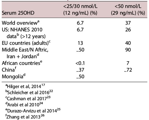 Although cutaneous vitamin D3 synthesis occurs rapidly in the presence of adequate solar UVB because of human behavior— indoor work, sun avoidance, etc.—vitamin D deficiency is wide- spread.(15) Using a definition of <20 ng/mL (<50 nmol/L),(16) as many as one third of the world7s population is deficient, with a percentage as high as 40% in Europe (Table 2). Severe vitamin D deficiency, defined as <30 nmol/L (or <12 ng/mL), is seen in approximately 7% of the population worldwide, with considerable variation observed between different countries and populations. Nevertheless, severe vitamin D deficiency occurs in high- risk populations worldwide.(17) High-risk groups for vitamin D deficiency include those who lack effective exposure to sunlight. This could be because ofavariety of climatologic, cultural, or religious reasons, as well to skin pigmentation. Vitamin D deficiency was long considered rare in Africa, but a systematic analysis of African countries revealed that severe vitamin D deficiency is present in18%ofall African subjects, with clusters having ahigh prevalence of deficiency widely dispersed based upon cultural/ behavioral practices.08-26)