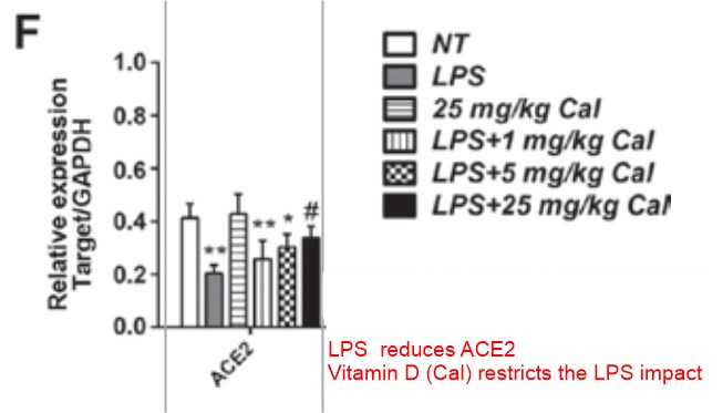 - From Discussion: "The mRNA expression levels of ACE and ACE2 in NT, LPS, and LPS + calcitriol-treated lung tissues were also determined, and the results demonstrated that LPS increased ACE expression and decreased ACE2 levels compared with the NT group. Calcitriol treatment inhibited the effects of LPS on ACE and ACE2 mRNA expression."