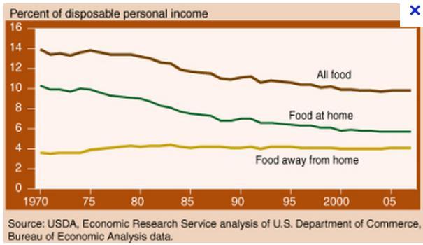 | Year | Food as % of Disposable income | Health care as % of GDP | Cost of Health care vs. food |