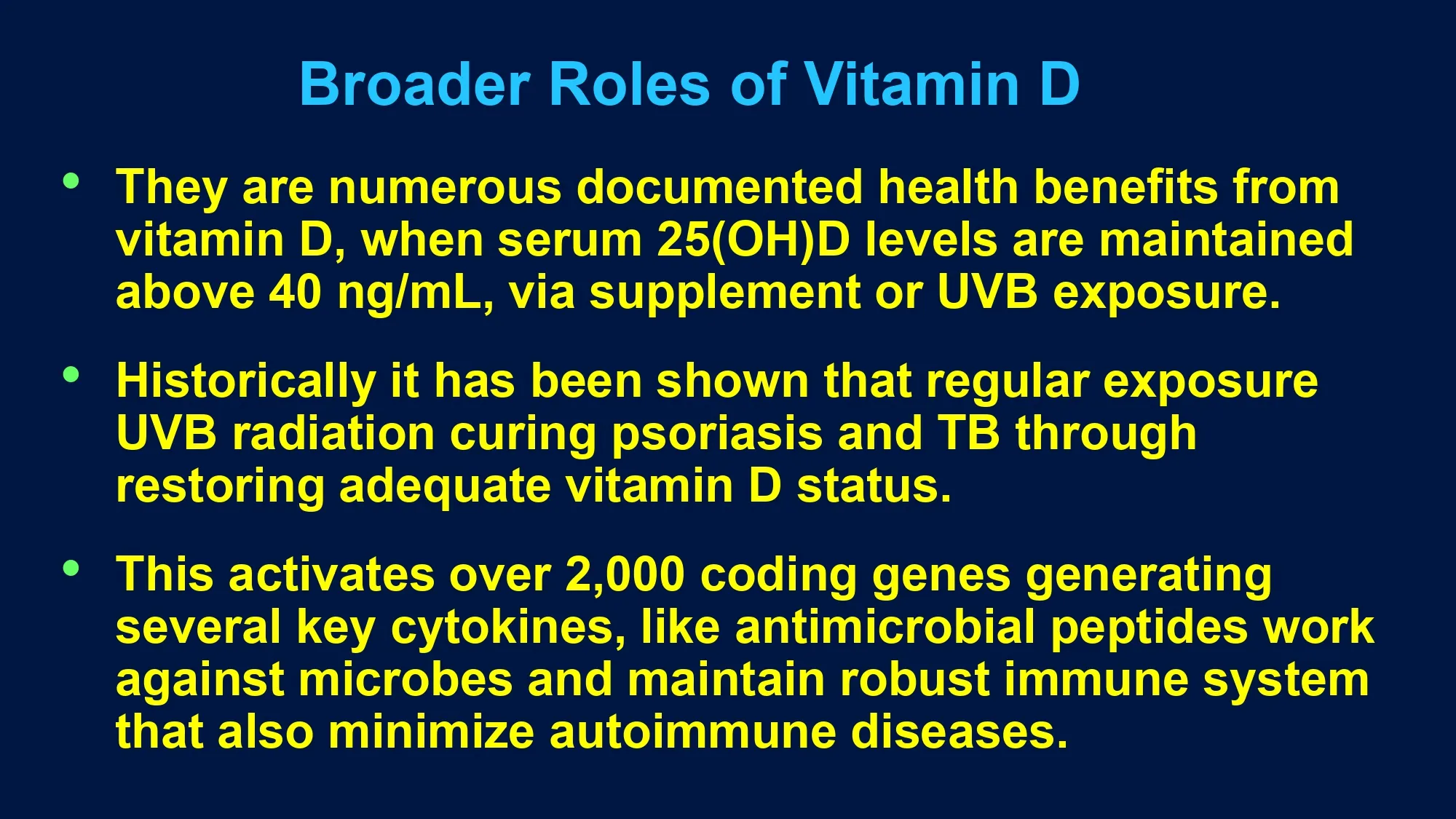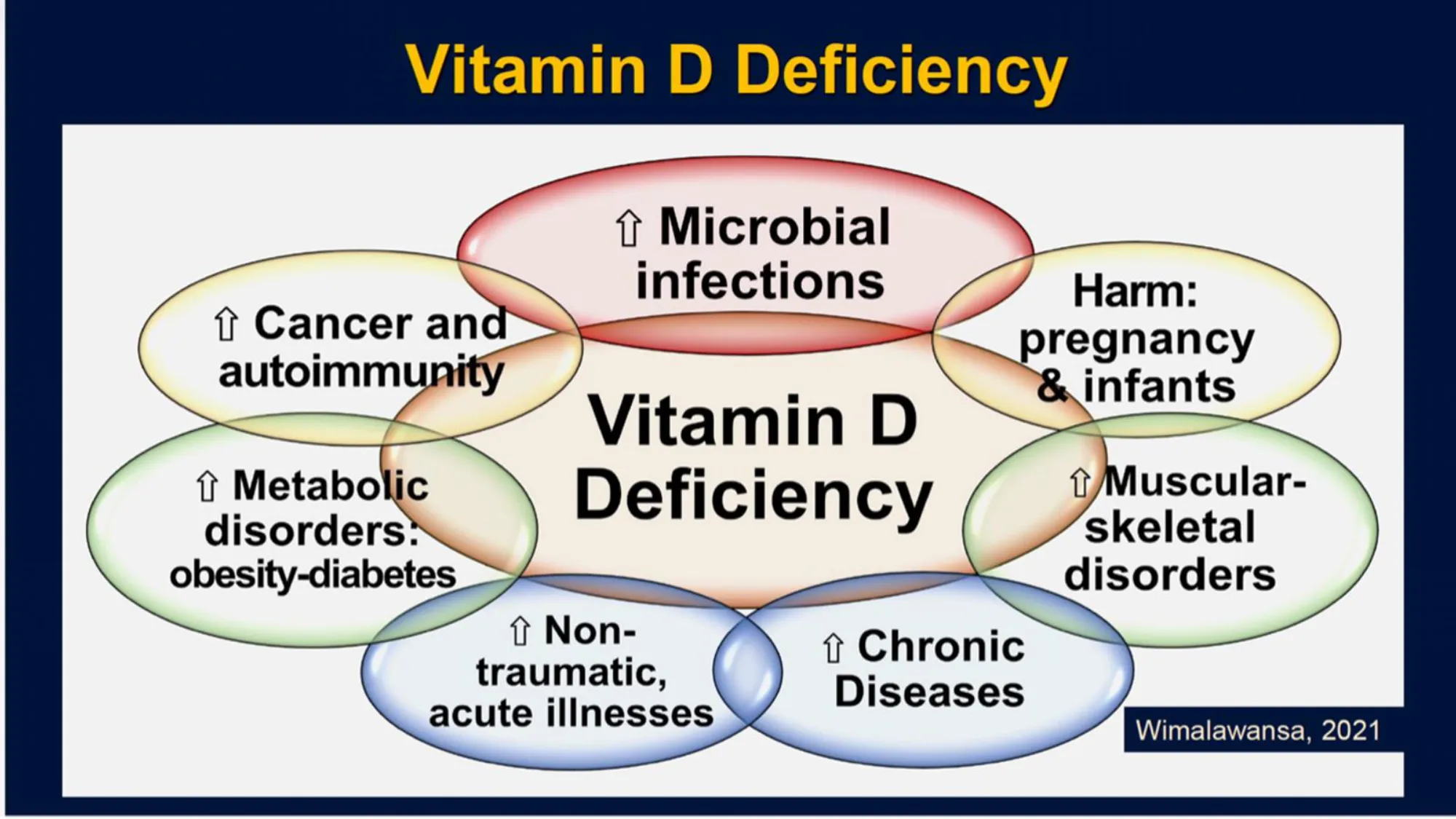 Now this is. I put that to 2 hours ago as you created these slides too. I thought that to be going to be useful. This may be jump in the gun, but at the same time it's actually important. One key aesthetic that you need to have about 40 nanograms per milliliter in the blood as a minimum vitamin D level for most of the diseases. But as you if anybody had read the Institute of Medicine report or in society, their recommending is 2020 nanograms. Meal washing arrived only for skeletal health prevention of recurs in children and osteomalacia in adults. Nothing else. 20 nanograms a milliliter doesn't touch any other diseases or any other body system. So that's why the problem problematic to rely on that. Now on the other hand, historically, I mean this is nothing new, but 30, 40, 50 years ago people have used a uv radiation by sunlight and also artificial uv radiation to treat tb, psoriasis and number of other diseases. Interestingly, when I was a medical student 50 something years ago, I worked for a rotation with the number one tb expert in the world that time, Professor Vairanathan. So I used to ask him why we are taking all the patient to sunshine during the 10:00 in the morning. Don't ask me a question, he says, because we didn't know the reasons behind it, why we are doing that. But the importance that vitamin D generated through the sun exposure and uv exposure has a tremendous amount of beneficial effects on the immune system, including the generation of antimicrobial peptides, a whole bunch of them. So those can actually kill the bacteria, intracellular bacteria like tuberculosis, sarco, and then also to improve the immune system function, to maintain a robust immune system. So this is a slide we publish in the nutrient to summarizing the effects of vitamin D deficiency. I mean, you can also convert this to what happened with vitamin D sufficiency or lack of disorders including cancer and autoimmunity, increasing the metabolic disorders like obesity, diabetes, type two diabetes, or type one diabetes. And then the non traumatic acute illnesses, many of them like pneumonia, to infection, to gastroenteritis, and a whole bunch of chronic diseases like osteoporosis, eye issues and, and then the musculoskeletal disorder is the one had been studies most over the past 80, 90 years. And indeed the pregnancy and the infant has a tremendous effect if we don't have the right level during the pregnancy and during lactation.