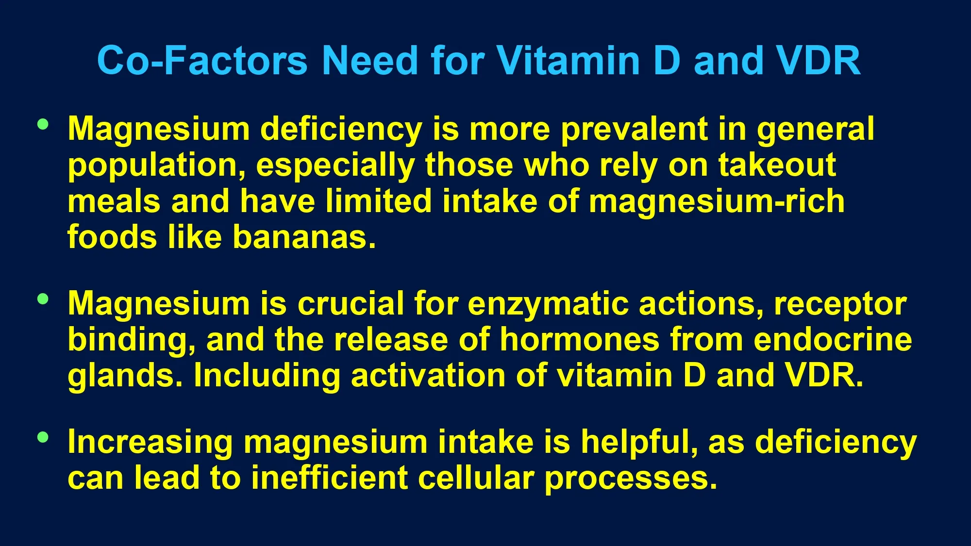 Okay, so here's a slide again, I prepared but 3 hours ago now. So anticipating these kind of questions. So there are several cofactors necessary for either vitamin D or vitamin D receptors or actually the combination of them for them to get together to go to the nucleus to do the genomic actions. So magnesium is one of the key players essential to have the for this particular role of vitamin D receptor activity. Magnesium also necessary for sip enzyme to activate vitaminD3 to 25 hydroxy D as well as Cassidy travolator. So it plays a role in every aspect. And this can be easily avoided by taking a full large size banana every day, which produces about 200 milligrams of magnesium, or take magnesium supplements every other day or something like that. And there's absolutely no harm by doing that kind of thing. But I don't want to see people taking two or three types a day and end up with diarrhea and all the other problems. Anything excess of good thing can be harmful. Now on top of that, there are a lot of other cofactors like resveratrol. And if you look at any of these recent publication, you can see that even omega three fatty acid is a cofactor for vitamin D receptor activity. So increasing magnesium itself, as I said here, is helpful to overcome this disorder. The problem is if you are magnesium deficient, you can give any amount of vitamin D. It may not be active.