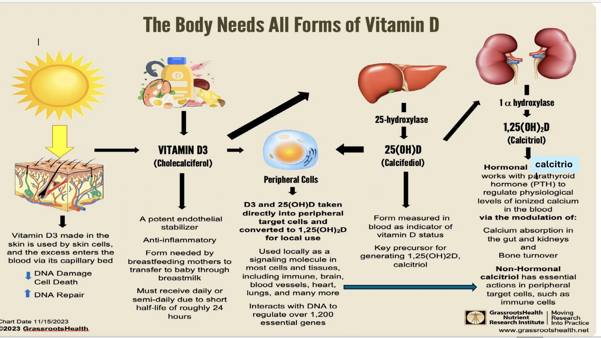 Let me see. Yeah, this is the slide from grassroots health Jen was referring to. So give a good idea of how the vitamin D generation generates. AndD3. And then theD3 is getting converted to 24 hydroxy d at the liver to 24 hydroxylase at the same time. As I said before, that part of that, perhaps a majority of that it absorb into the peripheral target cell. There are millions of them. And converted theD3 and 25 hydroxy D both not only 25 hydroxyl, butD3 and 25 hydroxy D into calcitriol. So bothD3 and 25 hydroxy D are the precursors for which partly generated from the kidney and the other part is generated for the peripheral cells for their own metabolism and activity. Importantly so that calcitriol is one bind to the VDR, what I call actually CTR calcitonin receptor. Together that complex going and bind to the DNA promoter regions and either increase or suppress the gene expression. So that's a genomic part of the action of vitaminD3. However, the vitaminD3, sorry caccitriolose have a non genomic part of vitamin D. It has effects on the membrane, membrane stabilization like in the muscles as well as the vascular endothelial cell, the stabilization depending on this one membrane effects and even more importantly the immune cells. This calcitriol acts as autocrine, also called intracrine and the paracrine effects. Let me explain the two important things. So this enough calcitriol within the immune cells can activate within the cells other area without going into the nucleus. So that's called the intracrine or para autocrine effects of vitamin D. Tremendous activity including the generation of antimicrobial peptides. The paracrine effects is less. Paracrine means actually that catheter will come out of the cells and act on the nearby immune cells. That defects. We don't know that much but it has been demonstrated in in vitro cell culture cells and it has a direct effect on adjacent cells. So all these things are important. But people are only concentrating on the catheter coming out of the kidney which is important but it's not the whole story.
