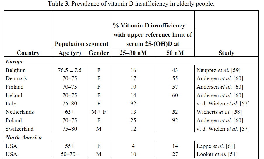 Data from 46 recent studies from Europe, North America, South-East Asia and the South Pacific area clearly indicate that a low vitamin D status and inadequate calcium nutrition are highly prevalent in the general population (30–80%), affecting both genders.