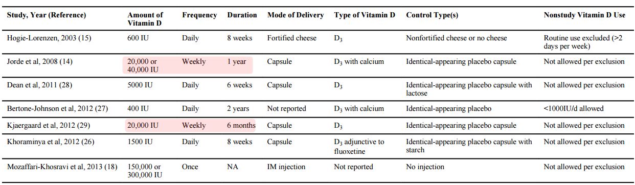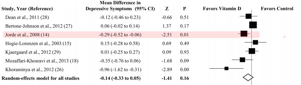 Objective: The aim of this study was to review the effects of vitamin D supplementation on depressive symptoms in randomized controlled trials. Although low vitamin D levels have been observationally associated with depressive symptoms, the effect of vitamin D supplementation as an antidepressant remains uncertain.