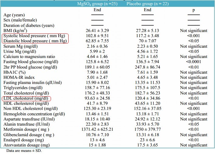 Daily administration of 300 mg elemental magnesium for 3 months, significantly improved fasting blood glucose (183.9±15.43 to 125.8±6.52 vs. 196.5±28.12 to 136.5±7.94, p< 0.0001), 2-hour post prandial glucose (239.1±74.75 to 189.1±60mg/dl vs. 246.4±97.37 to 247.8±86.74mg/dl, p< 0.01), lipid profile, blood pressure and hepatic enzymes.
