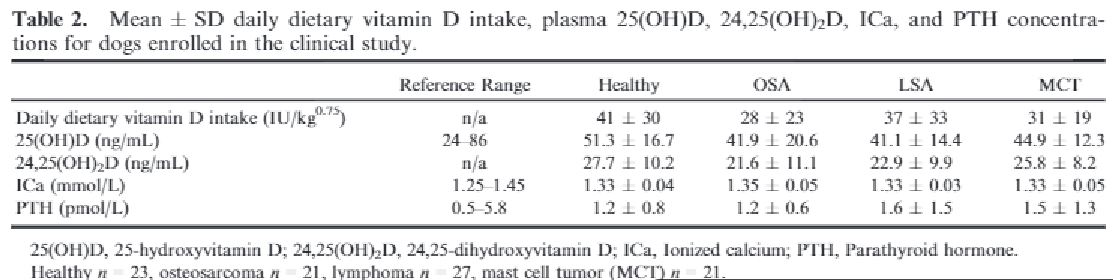 Results support a relationship between cancer and altered vitamin D metabolism in dogs, mediated by plasma ICa concentrations. The CYP24A1 activity and plasma ICa should be measured in studies examining plasma 25(OH)D concentrations in dogs.Dogs with Cancer have low vitamin D, same as humans – Sept 2017Printer Friendly Follow this page for updates7632 visitors, last modified 20 Sep, 2022, This page is in the following categories (# of items in each category)Attached files
