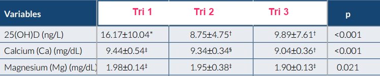 By analyzing the differences between the groups, the vitamin D, calcium, and magnesium levels were found to decrease with increase in the gestational weeks.Conclusion: For maintaining a healthy pregnancy and fetus, we recommend vitamin D, calcium, and magnesium levels to be included in routine follow-ups for each trimester and supplemented in case of deficiency.