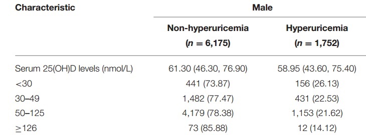 CONCLUSION: Both patients with vitamin D insufficiency and patients with vitamin D deficiency had a significantly higher level of serum uric acid compared with individuals with normal vitamin D level.