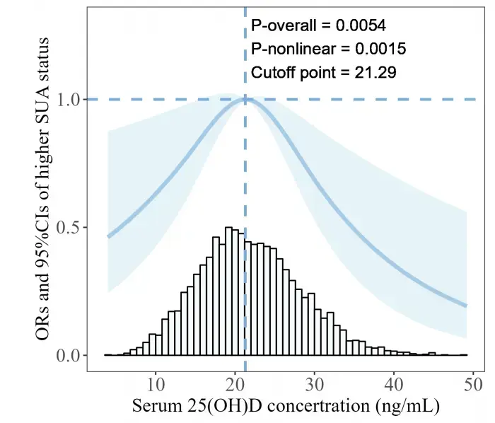 Conclusions: An inverse U-shaped relationship was observed between vitamin D and SUA as well as the risk of higher SUA status. Sufficient vitamin D levels appear to play a preventative role against the age-related increase in SUA. Ensuring adequate vitamin D levels may be beneficial in improving uric acid metabolism.