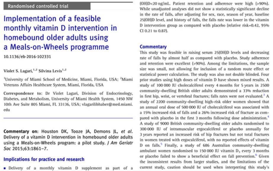 - 2X fewer Senior falls in group getting 100,000 IU vitamin D monthly via Meals-on-Wheels – RCT Aug 2015