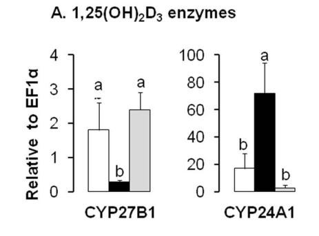 Replacing glucose with fructose prevented these increases in Ca2+ transporter, CYP27B1, and 1,25(OH)2D3 levels induced by a low Ca2+ diet. In adult mice fed for three mo a normal Ca2+ diet, renal expression of CYP27B1 and of CYP24A1 (24-hydroxylase) decreased and increased, respectively, when the carbohydrate source was fructose instead of glucose or starch. Intestinal and renal Ca2+ transporter activity and expression did not vary with dietary carbohydrate. To determine the time course of fructose effects, a high fructose or glucose diet with normal Ca2+ levels was fed to adult rats for three mo. Serum levels of 1,25(OH)2D3 decreased and of FGF23 increased significantly over time.
