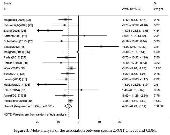 The meta-analysis of 20 studies including 9209 participants showed that women with vitamin D deficiency experienced a significantly increased risk for developing GDM (odds ratio (OR) = 1.53; 95% confidence intervals (CI), 1.33, 1.75) with a little heterogeneity (I2 = 16.20%, p = 0.252). A noteworthy decrease of 4.93 nmol/L (95% CI, −6.73, −3.14) in serum 25(OH)D was demonstrated in the participants with GDM, and moderate heterogeneity was observed (I2 = 61.40%, p = 0.001). Subgroup analysis with study design showed that there were obvious heterogeneities in nested case–control studies (I2 > 52.5%, p < 0.07). Sensitivity analysis showed that exclusion of any single study did not materially alter the overall combined effect. In summary, the evidence from this meta-analysis indicates a consistent association between vitamin D deficiency and an increased risk of GDM. However, well-designed randomized controlled trials are needed to elicit the clear effect of vitamin D supplementation on prevention of GDM.