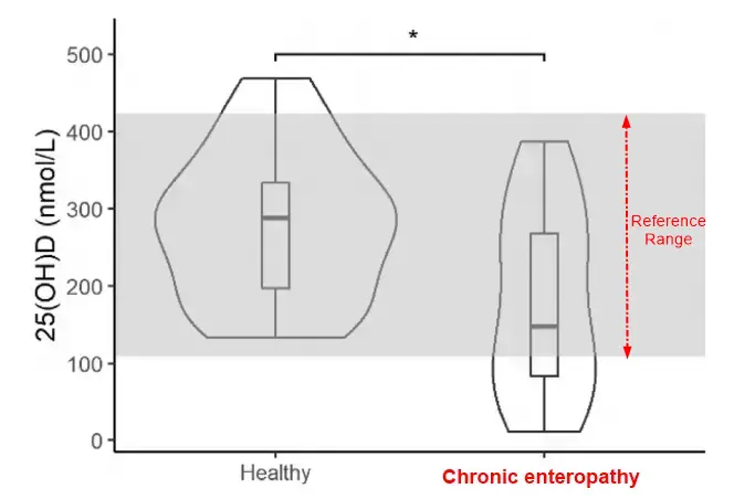 Background: In inflammatory bowel disease (IBD) of humans, nutrient malabsorption can result in fat-soluble vitamin deficiency, especially of vitamin D. In veterinary species, decreased concentrations of vitamin D are relatively common in dogs with chronic enteropathy (CE), but data on the status of other fat-soluble vitamins (FSVs) is lacking.