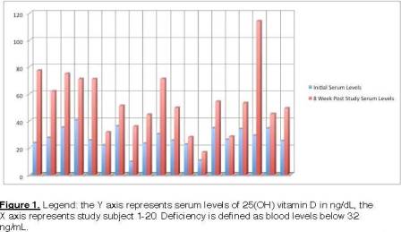 Prior to supplementation 75 percent of the subject were deficient in vitamin D and 10 percent of the subjects were severely deficient (as defined by blood levels less than 10 ng/mL).After the eight-week supplemental period the average 25(OH) vitamin D blood level was 54 ng/mL, a 106 percent average increase. Post supplementation 15-study subjects, or 75 percent, had serum levels more than the deficiency blood level of 32 ng/mL (pre-supplementation 75 percent were deficient).