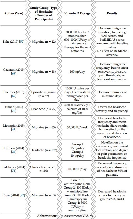 Overall, there is not enough evidence to recommend vitamin D supplementation to all headache patients, but the current literature indicates that it may be beneficial in some patients suffering headaches, mainly migraineurs, to reduce the frequency of headaches, especially in those with vitamin D deficiency