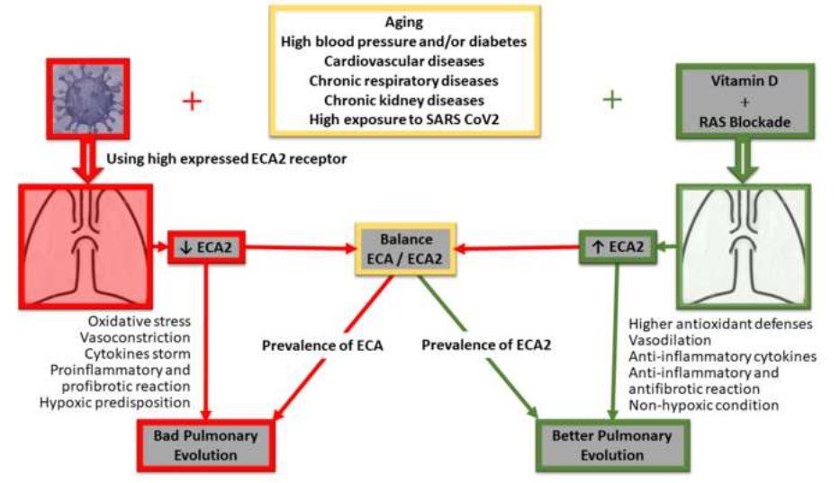 More recently, multiple pleiotropic effects have been demonstrated on the actions of vitamin D at the anti-inflammatory and immunomodulatory level with positive results in studies with influenza, coronavirus, and other respiratory infections. An inverse relationship between serum vitamin D levels and the prevalence of the respiratory infectious disease has been described. Of interest, another mechanistic approach responds to considering the inhibition of the renin-angiotensin- aldosterone system (RAAS), which is exacerbated in COVID-19 infection because the virus binds to the enzyme ACE2, making more angiotensin II available to cause damage.