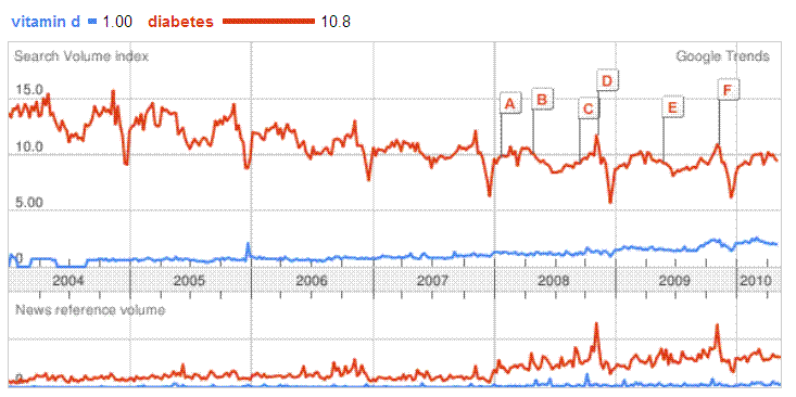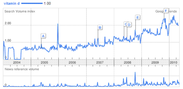Now that we have a base line of volume of searches on vitamin D, it will be interesting to see what happens when the new report comes out from the Food and Nutrition Board of the Institute of Medicine. We await patiently.