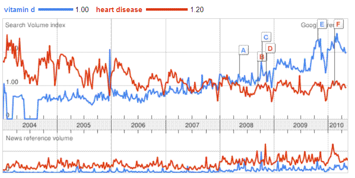 Vitamin D, Heart Disease Wow now that is really cool as we see that searches for vitamin d went above the volume of searches for heart disease in 2007.