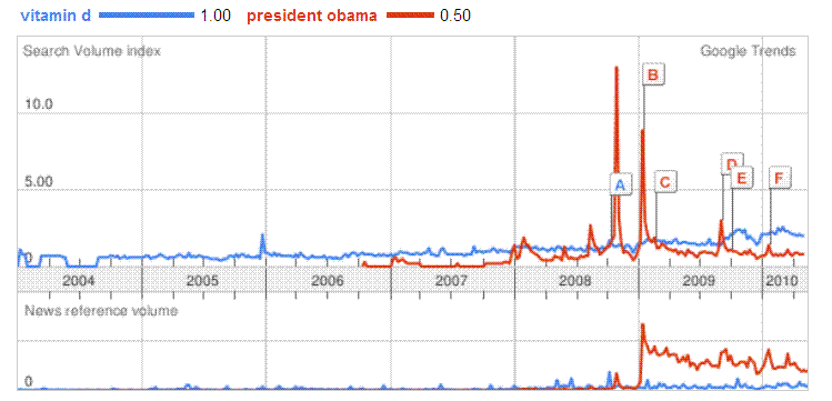 Vitamin D, President Obama Sorry Mr. President, although you have had some spikes of interest, the searches on google show there is more interest in vitamin D than in you. Maybe you should go spend some time in the sun. (I am sure I could have manipulated the name and made the trends look significantly different)